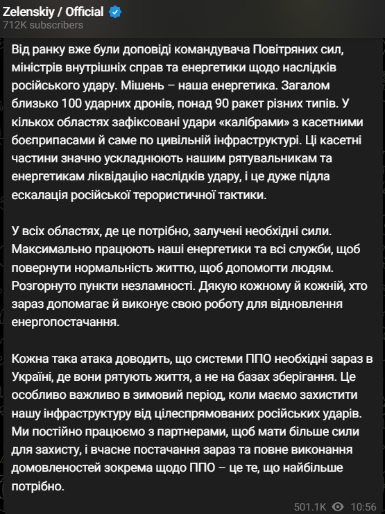 "Ці касетні частини значно ускладнюють нашим рятувальникам та енергетикам ліквідацію наслідків удару, і це дуже підла ескалація російської терористичної тактики", - пише президент.