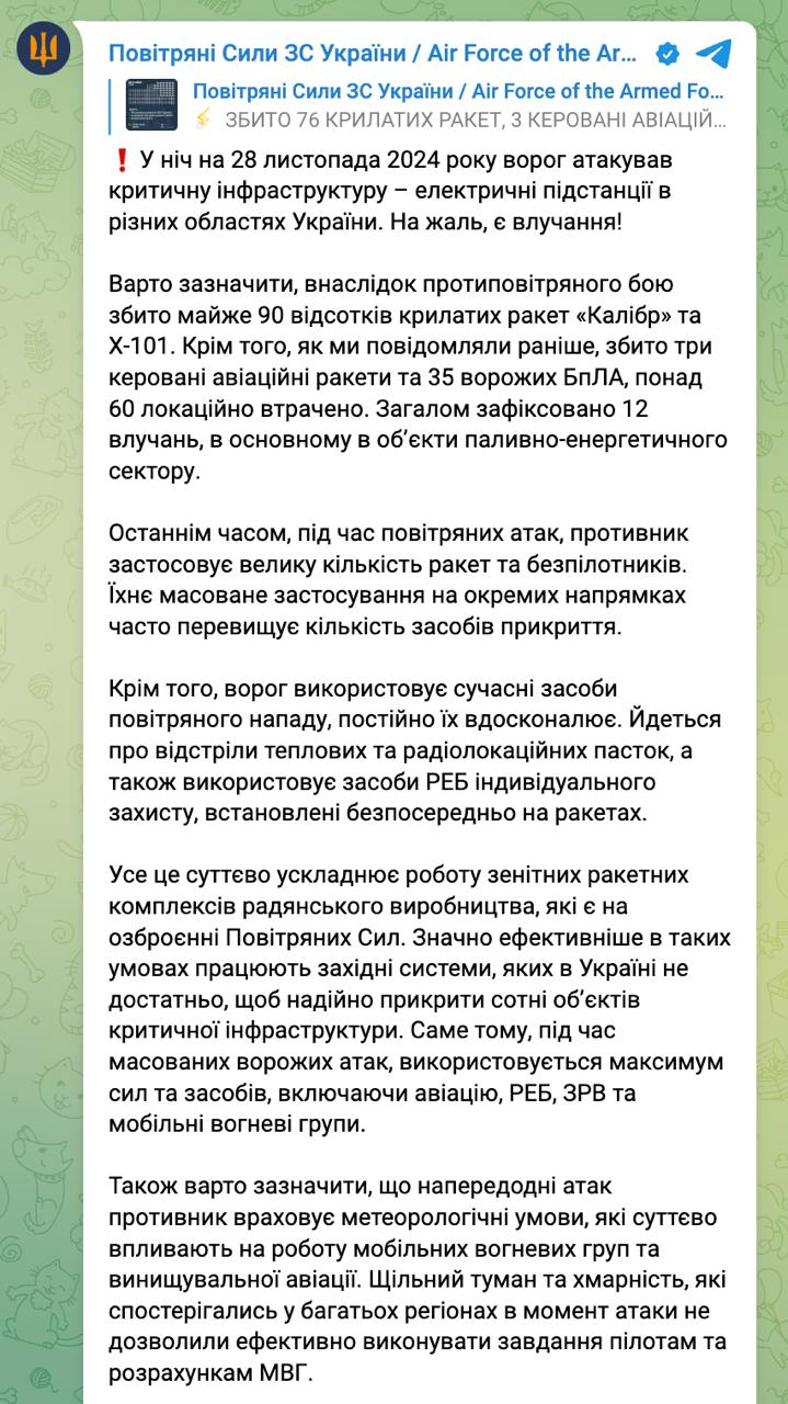 ПС заявляють, що збили майже 90% крилатих ракет і перераховують складності своєї роботи: ракет і дронів часто на порядок більше, ніж засобів прикриття, західної зброї не вистачає, РФ удосконалює способи обстрілів і підбирає для атаки погоду: туман і хмарність.