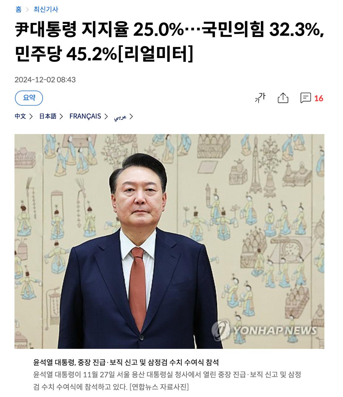 17.50 Напередодні сьогоднішніх подій у Сеулі агентство "Ренхап" опублікувало свіже соцопитування, яке показало рейтинг президента Юн Сок Йоля на рівні 25%. При цьому негативна оцінка дій президента становила 71,0%.