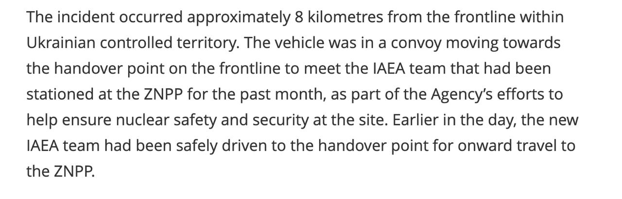 При цьому МАГАТЕ вже офіційно підтвердило, що автомобіль був атакований на території, підконтрольній Україні – приблизно за 8 км від лінії фронту. До жодної зі сторін агентство звинувачень не висувала.