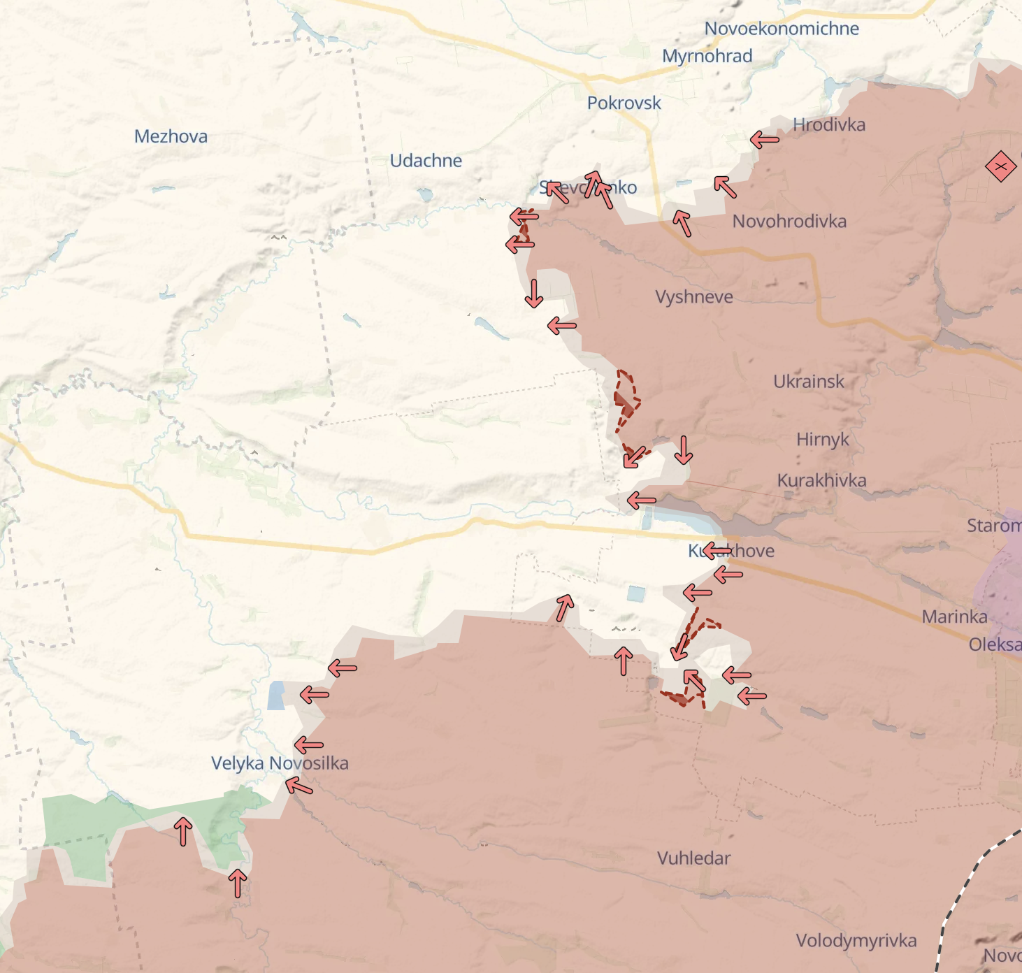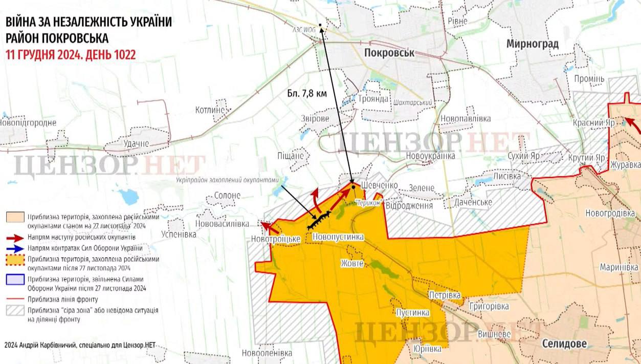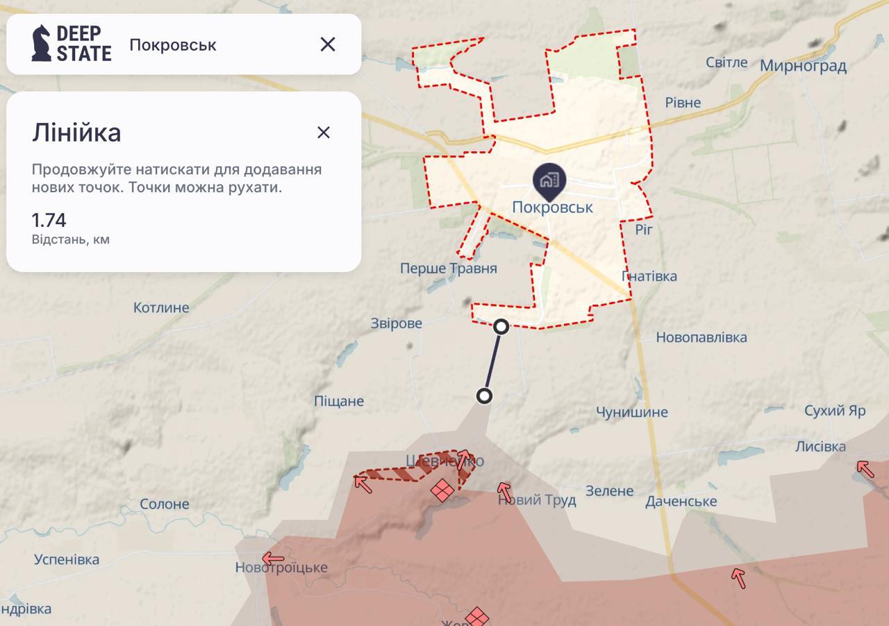 Український військовий оглядач Богдан Мірошников пише, що окрім захоплення села Шевченка, звідки відкривається прямий найкоротший шлях до Покровська, росіяни досягли околиць Даченського та захопили частину Відродження, "які дозволяють повільно виходити на південні підступи Покровська".