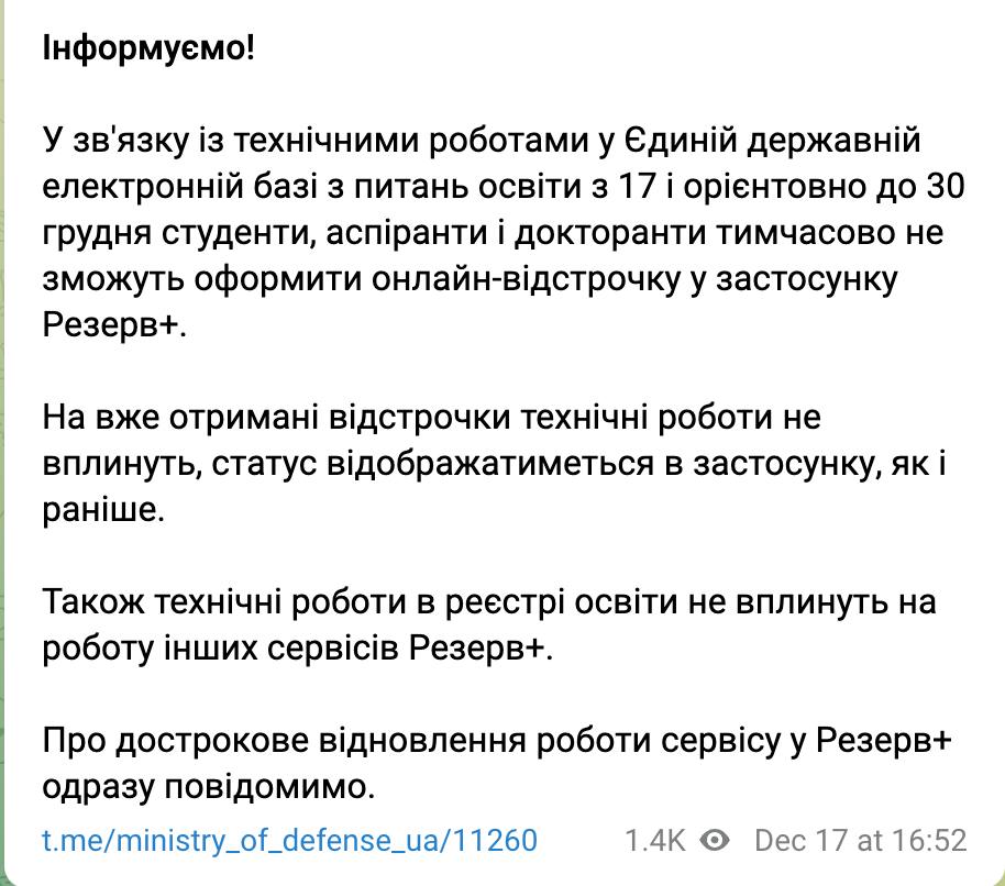 17:00 З сьогоднішнього дня і до кінця року студенти, аспіранти та докторанти не зможуть оформити відстрочку в "Резерв+", повідомляє Міноборони.