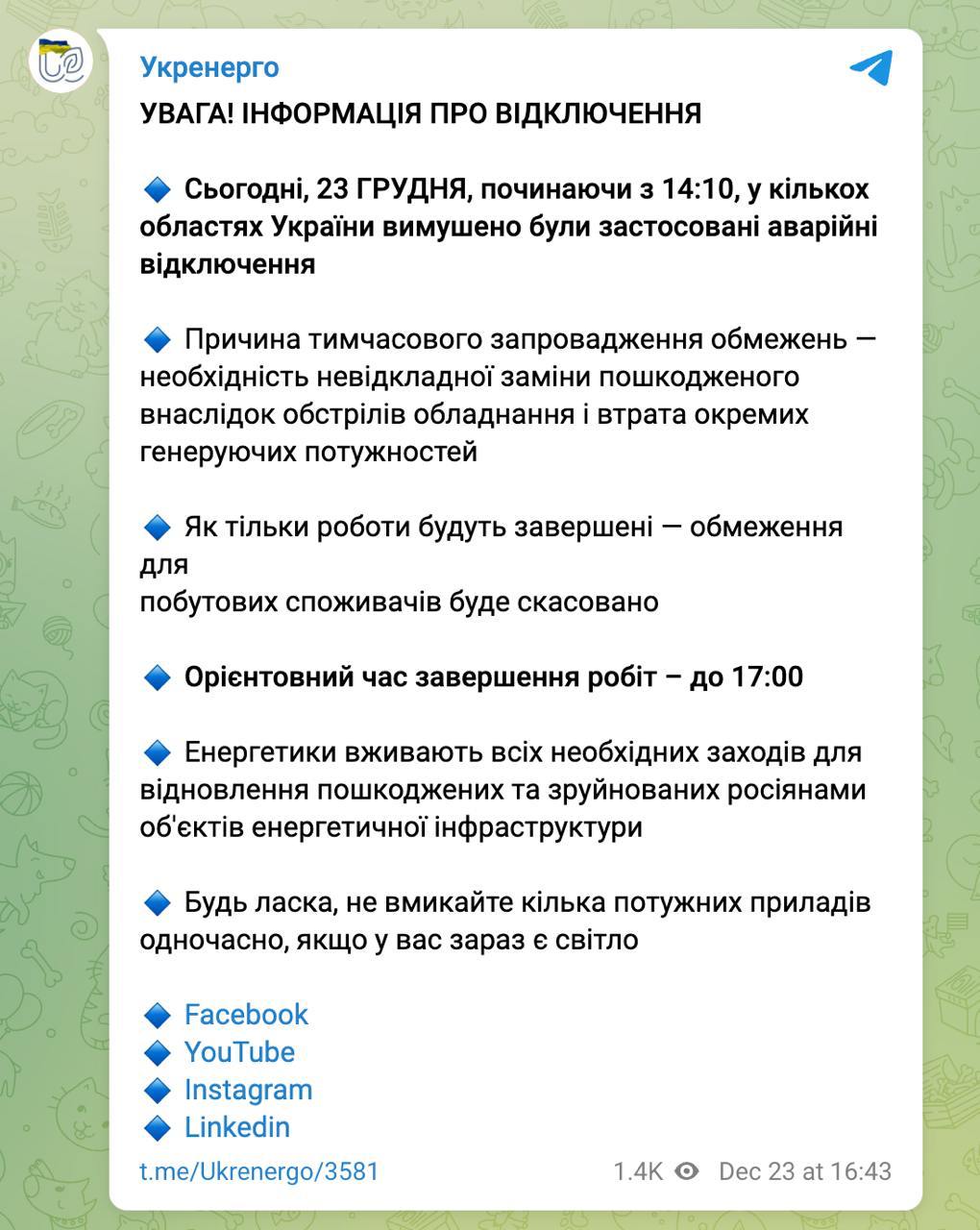 Аварійні відключення в Україні планують скасувати до 17:00.