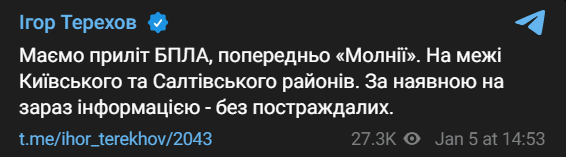 "Є приліт БПЛА, попередньо "Блискавки". На кордоні Київського та Салтівського районів. За наявною на даний момент інформацією - без постраждалих", - написав Терехов.