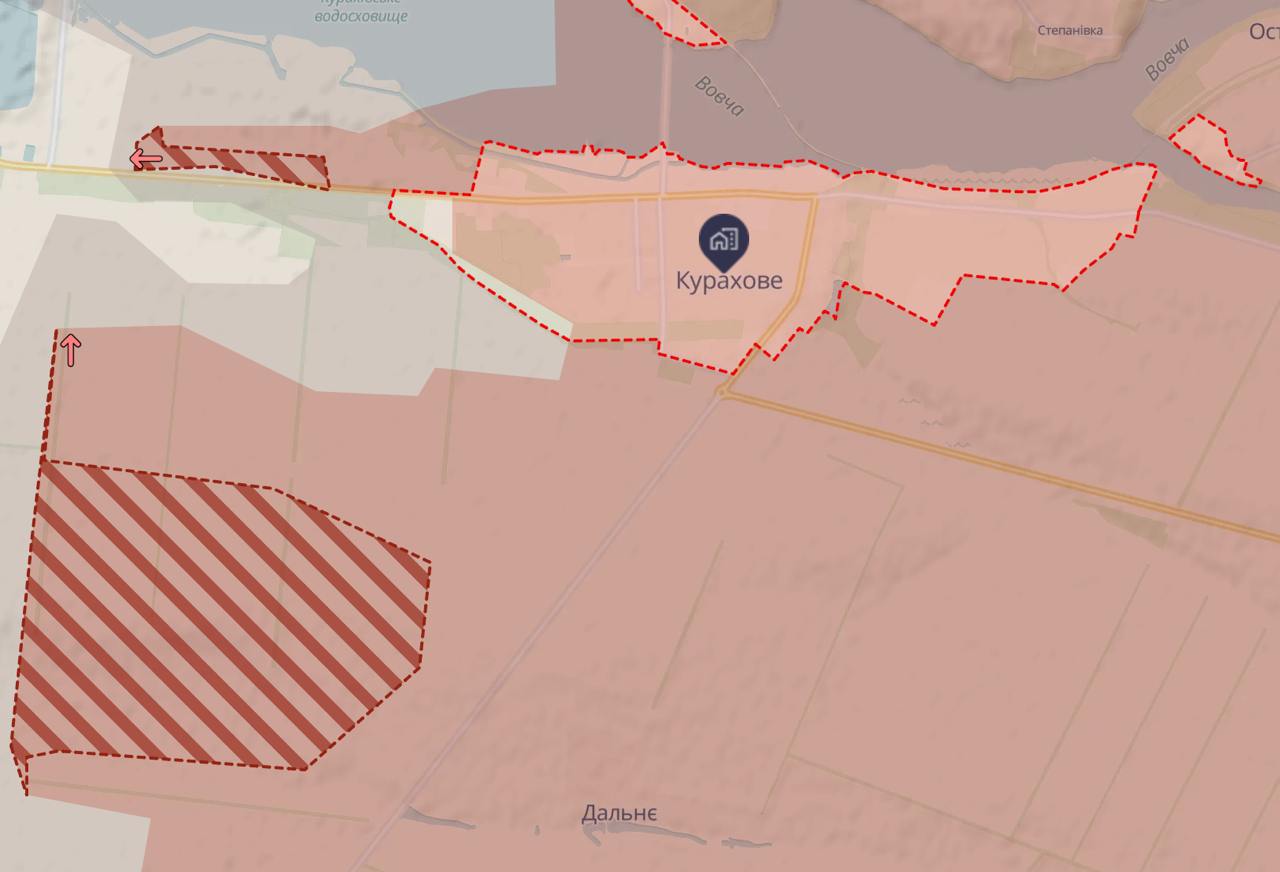 08:22 Російські війська закріпилися біля траси на захід від Курахового, показує мапа українського військового паблика Deep State.