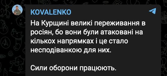 "На Курщині великі переживання у росіян, тому що вони були атаковані за декількома напрямками і це стало несподіванкою для них. Сили оборони працюють", - заявив голова ЦПД Коваленко.