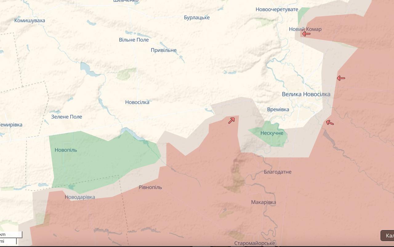 "Більше того, противник бачить ці погрози і робить певні кроки, щоб убезпечити свої наступні тактичні групи від цих несподіванок. Наприклад, 127-а мсд противника, одночасно з настанням до дороги на Успенівку на ділянці Врем'ївки, намагається також просунутися і в бік самого селища Новосілка (вздовж ставків на р.Ворона, на південь від селища), щоб убезпечити свій лівий фланг від можливих контратак ЗСУ. Тому, на жаль, мій песимізм, щодо подальшої оборони Великої Новосілки - цілком обґрунтований", - підсумовує Машовець.