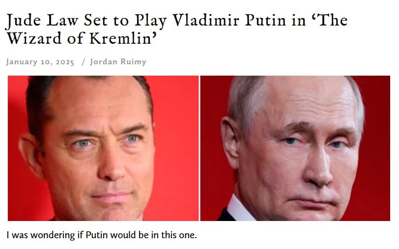 Французькі кіностудії Curiosa Films та Gaumont знімають фільм "Кремлівський чарівник" про Володимира Путіна. Роль російського політика у ньому грає британський актор Джуд Лоу, про затвердження якого і початок роботи над стрічкою стало відомо у травні минулого року.