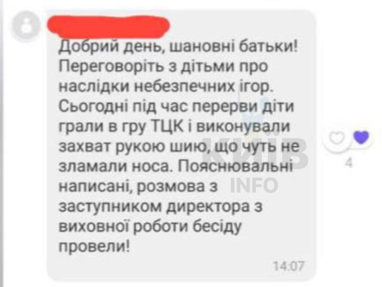 "Шановні батьки! Поговоріть з дітьми про наслідки небезпечних ігор. Сьогодні на перерві діти грали в гру ТЦК і виконували захоплення рукою шиї, мало не зламали носа", – написав педагог у групі батьків одного з класів.
