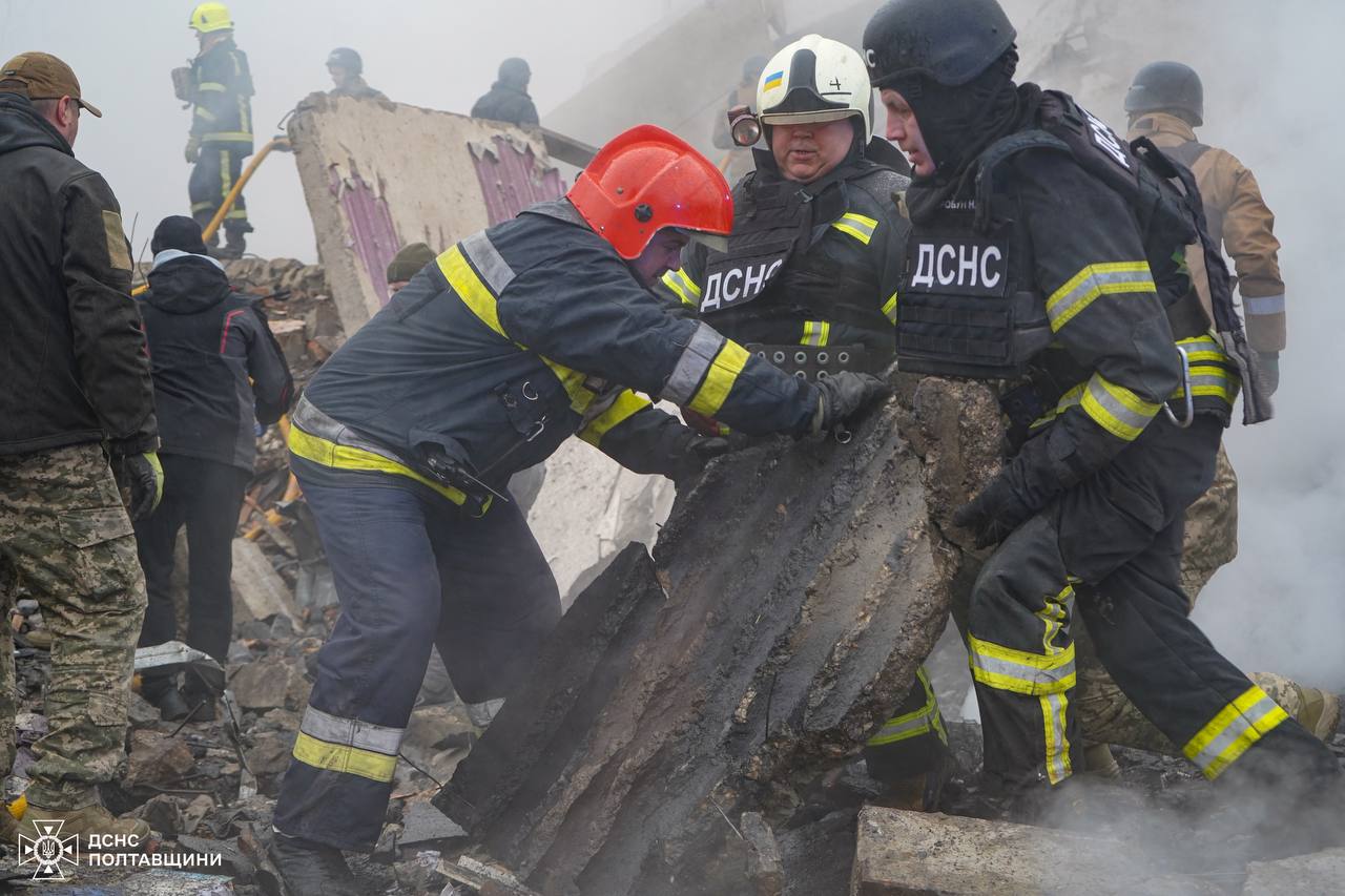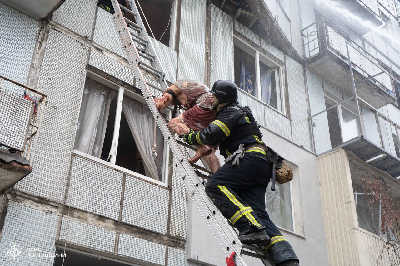 Наслідки удару по житловій багатоповерхівці у Полтаві. Фото: ДСНС