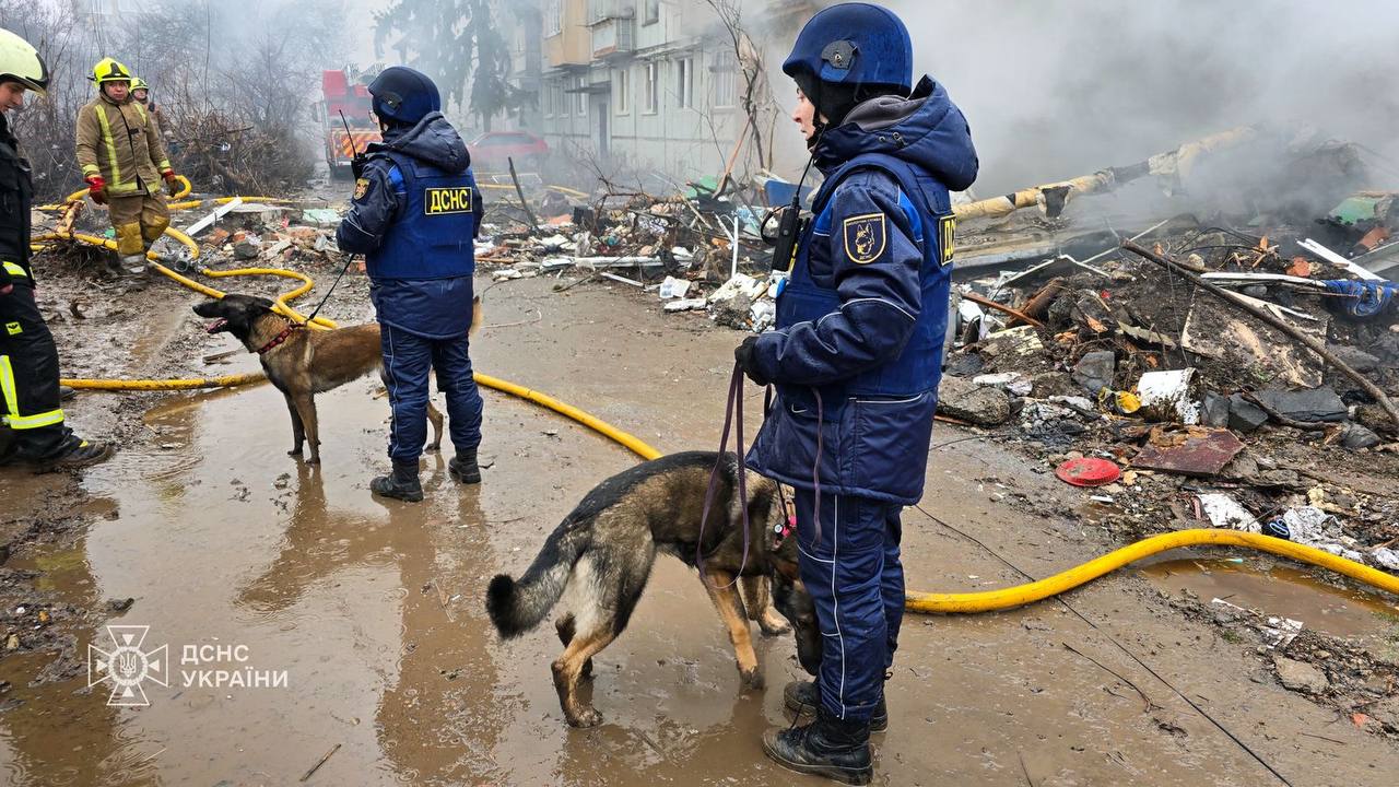 На місці події продовжуються аварійно-рятувальні роботи. Задіяні кінологи ДСНС із підготовленими пошуковими собаками.