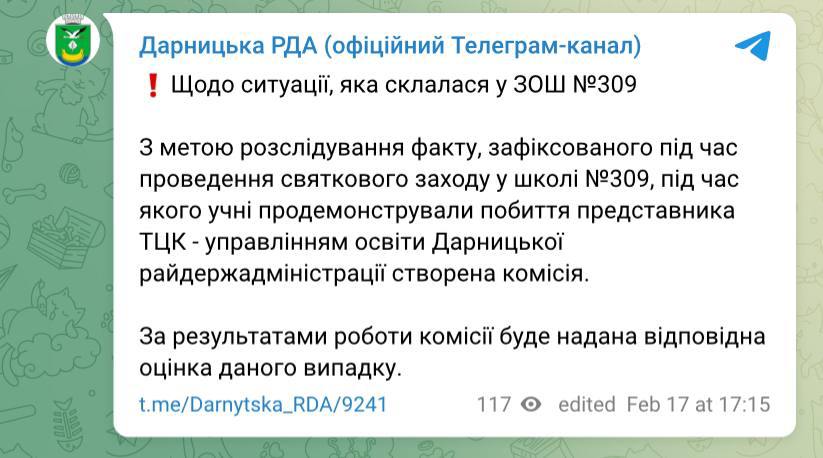 Після публікації ролика Дарницька районна адміністрація Києва повідомила, що створила комісію, яка проведе розслідування щодо сценки зі побиттям співробітника ТЦК.