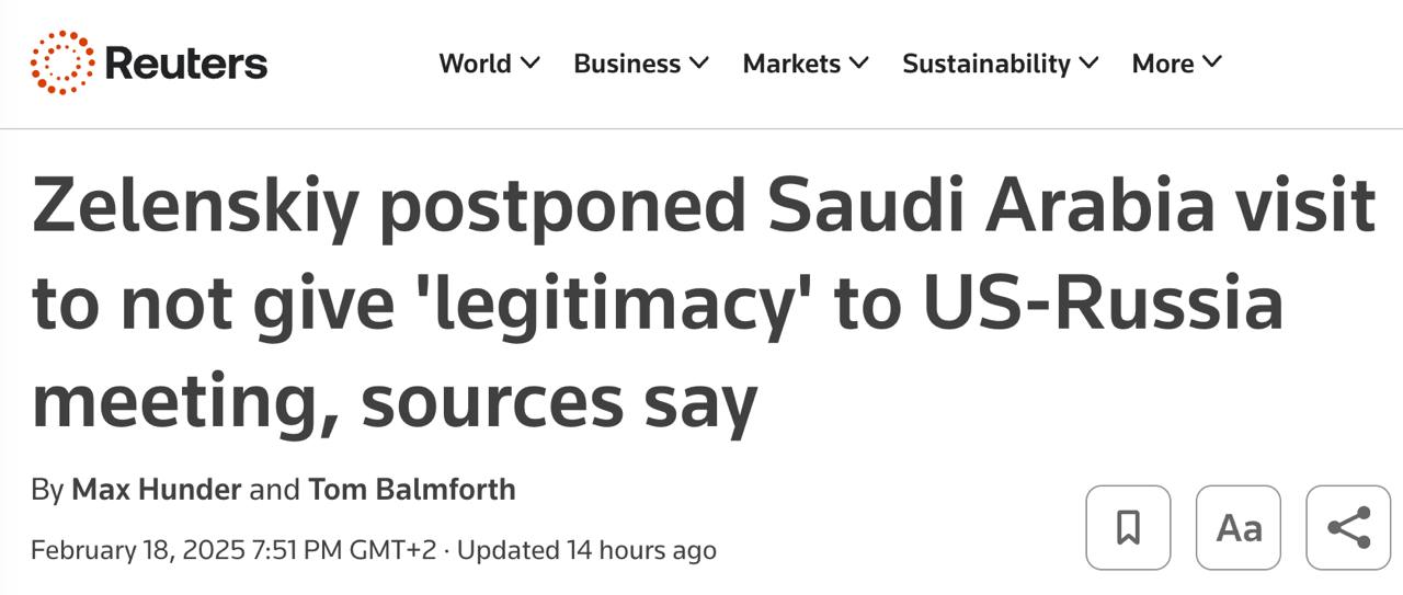 Спочатку Зеленський мав відвідати Саудівську Аравію 19 лютого в рамках офіційного візиту, проте перед зустріччю делегацій Росії та США він повідомив про відміну поїздки. За його словами, він не бажає, щоб за його спиною приймалися будь-які рішення.