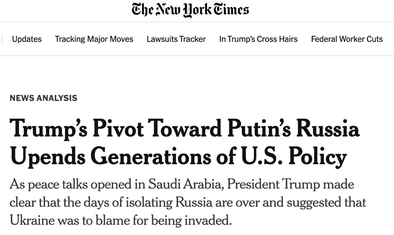 "Трамп знаходиться в процесі здійснення одного з найбільш приголомшливих поворотів в американській зовнішній політиці за останні покоління, повороту на 180 градусів, який змусить друзів і ворогів переглянути свої погляди в фундаментальних відносинах. З моменту закінчення Другої світової війни довгий парад американських президентів спочатку розглядав Радянський Союз, а потім, після, слід принаймні побоюватися. Трамп робить усе можливе, щоб розглядати її як співучасника у майбутніх спільних підприємствах", - написала NYT.