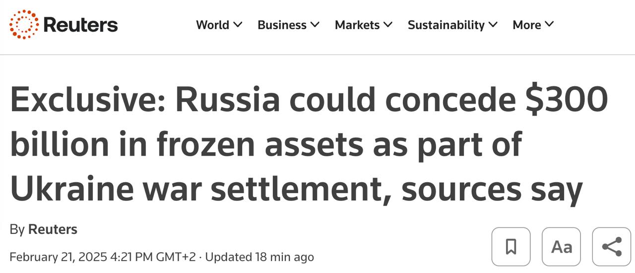 Росія може дати згоду на використання для відновлення України 300 мільярдів доларів її активів, заморожених у Європі.