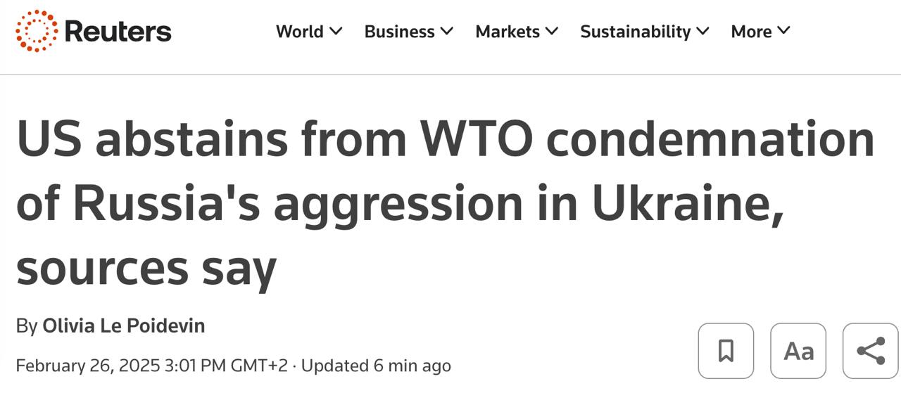 "США вперше не підтримали заяву, яка щорічно виходить із лютого 2022 року... Це чергова вказівка на ближчі зв'язки з Росією", - вважає агентство.
