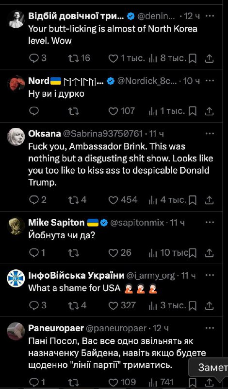"Fuck you, Ambassador Brink". Українці відреагували на пост посла США в Україні із критикою Зеленського