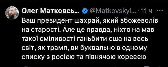 "Ваш президент шахрай, який збожеволів на старості років", "Йди на х…й, посол Брінк. Це було просто огидне лайнове шоу. Схоже, ти теж любиш цілувати дупу Дональду Трампу" (переклад з англійської мови).