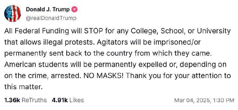 "Все федеральне фінансування припиниться для будь-якого коледжу, школи чи університету, які допускають незаконні протести. Агітатори будуть ув'язнені або назавжди відправлені назад до країни, з якої вони приїхали. Американські студенти будуть назавжди виключені або, залежно від злочину, заарештовані. Жодних масок!" - написав Трамп у своїй соцмережі.