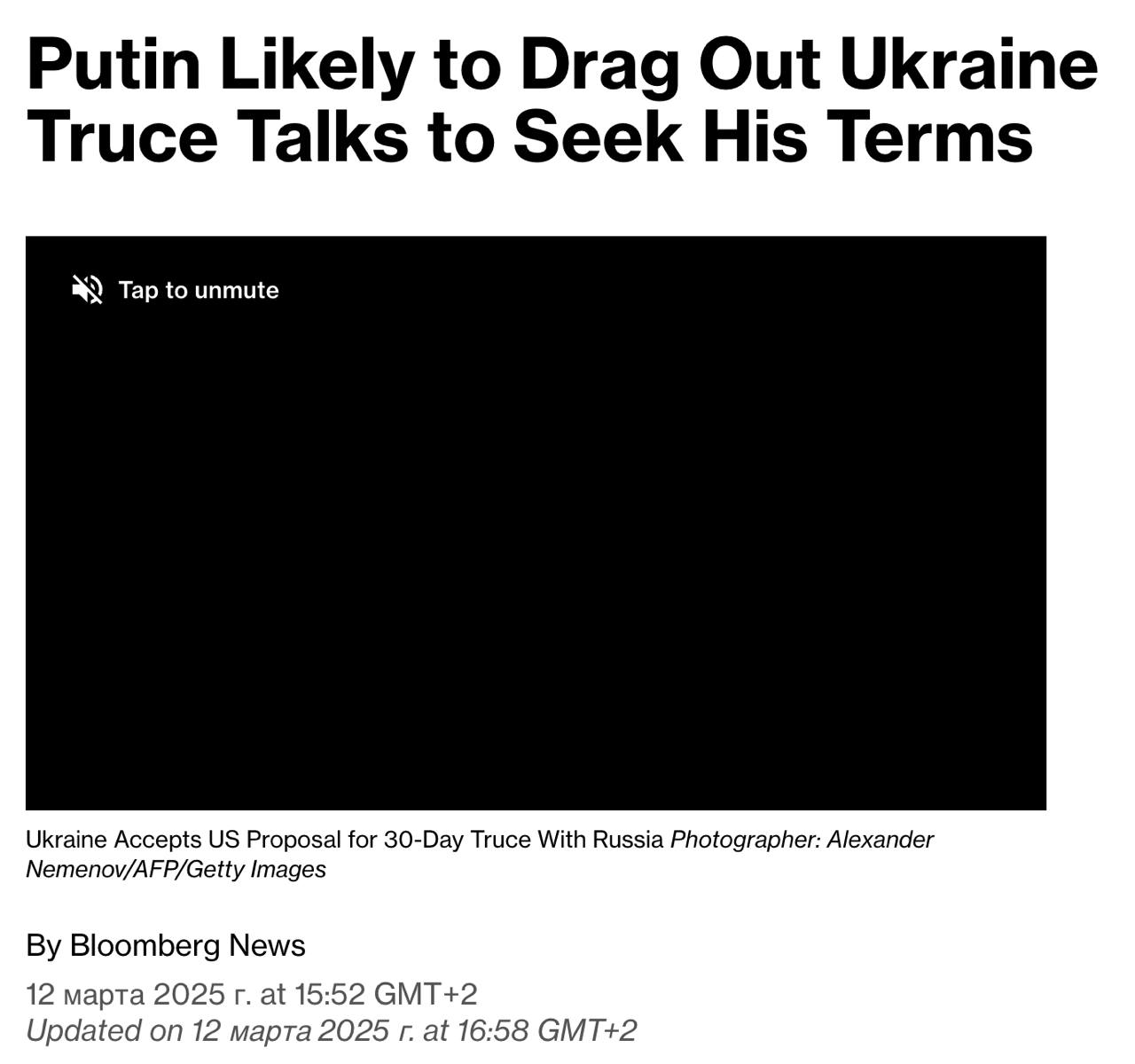 17.25 Путін, ймовірно, погодиться на перемир'я в Україні, але виставить умови, пише Bloomberg з посиланням на джерела.