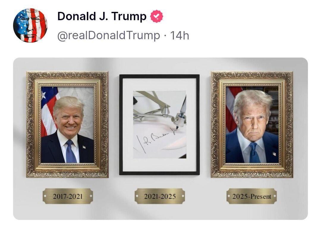 На своїй сторінці у власній соціальній мережі Truth Трамп опублікував зображення, де на президентському фото Байдена зображено не портрет, а пристрій для підпису.