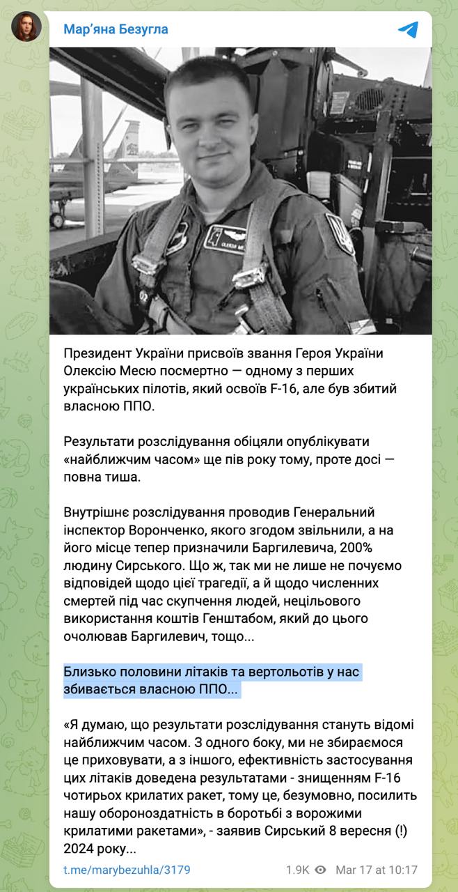 Так вона прокоментувала посмертне присвоєння звання Героя України пілоту Олексію Месю, який одним із перших освоїв управління американськими винищувачами F-16, "але був збитий власною ППО".