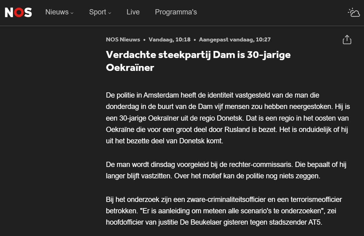 "Поліція Амстердама встановила особу чоловіка, який, ймовірно, у четвер завдав ножових поранень п'ятьом людям недалеко від площі Дам", - пише видання.