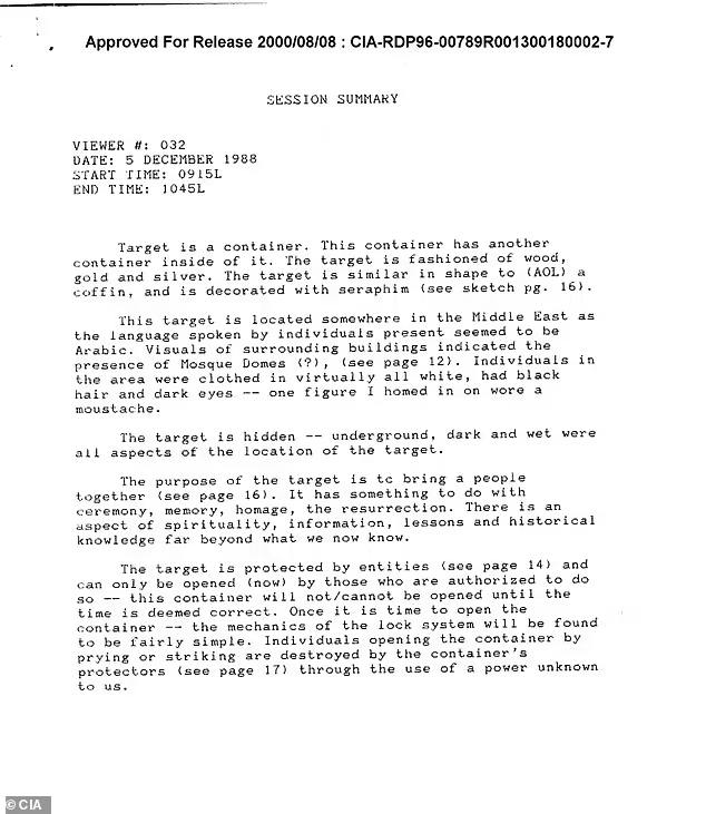 Як описано у звіті розвідуправління від 5 грудня 1988 року, перед одним із медіумів за №032 поставили завдання знайти "певний предмет", але не пояснили йому, що це ковчег Завіту. Екстрасенс описав ковчег Завіту як скриню, виготовлену з дерева, золота та срібла, із зображеннями шести крилатих ангелів. За його словами, він "десь на Близькому Сході".