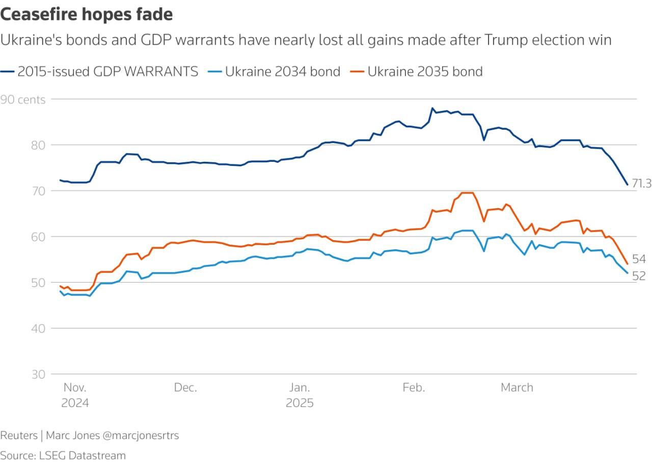Ціна українських облігацій різко обвалилася через сумніви інвесторів у перспективі укладання мирної угоди.