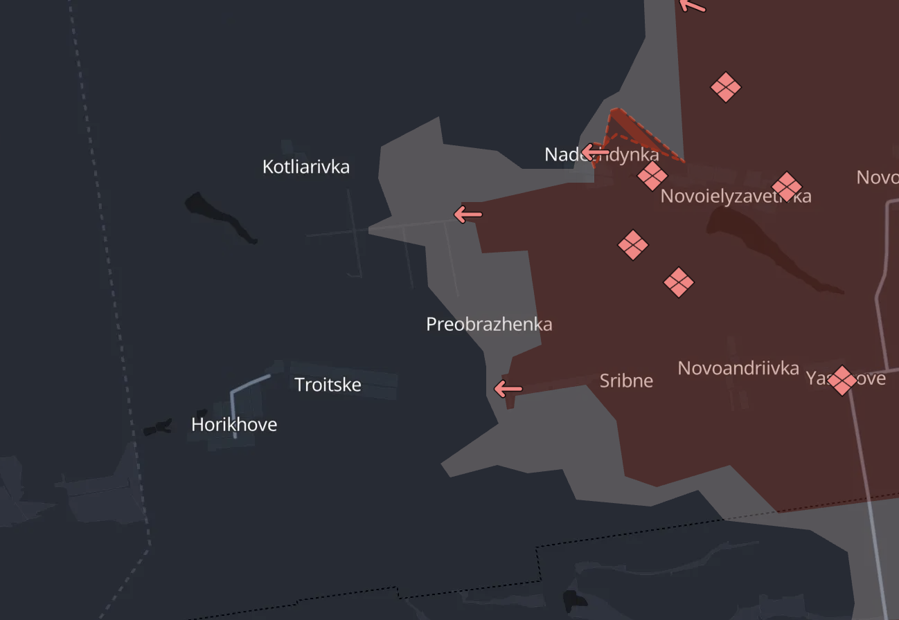 Російські військові телеграм-канали пишуть про захід до сусідньої Котлярівки та взяття школи у селі Троїцьке. Україна цього не підтверджувала. На карті Deep State у цих селах присутності РФ немає.