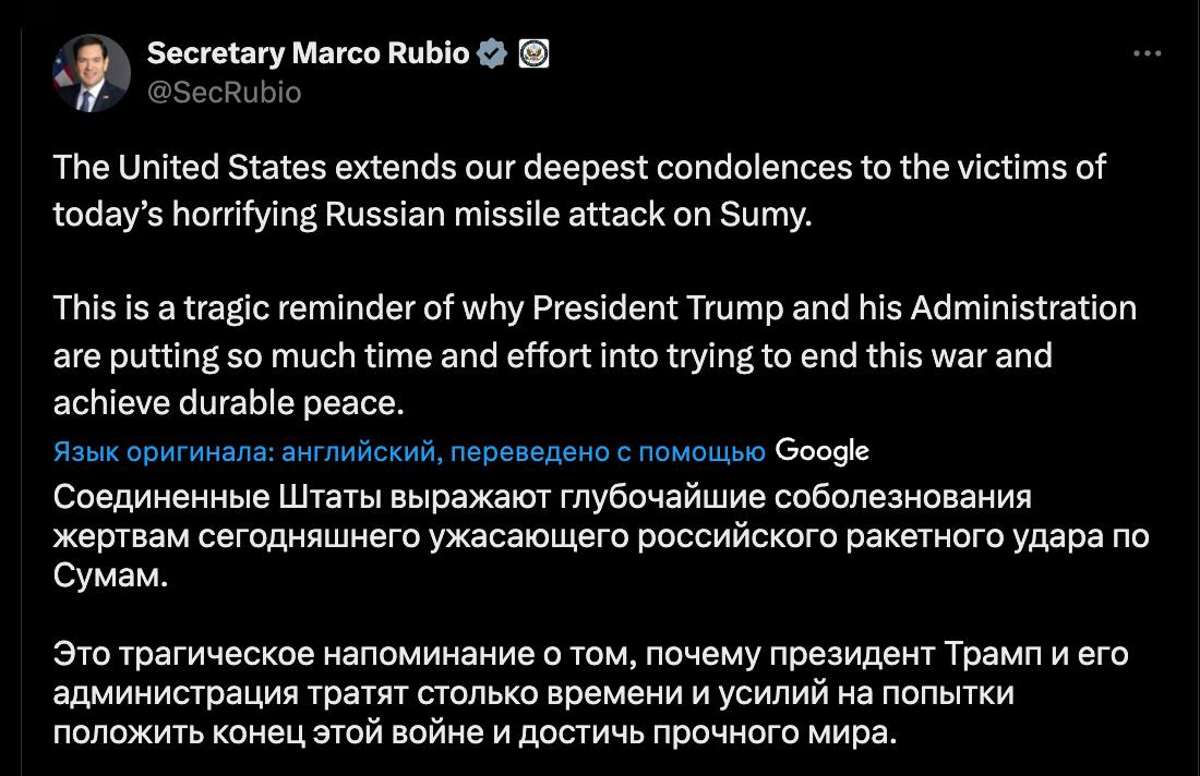 Держсекретар Сполучених Штатів Марко Рубіо висловив співчуття жертвам ракетного удару, завданого армією РФ по обласному центру Сумщини.