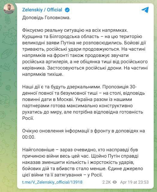 21:20 Зеленський дав зрозуміти, що Україна підтримає пасхальне перемир'я, яке оголосив Путін, за умови, що Росія його дотримуватиметься.