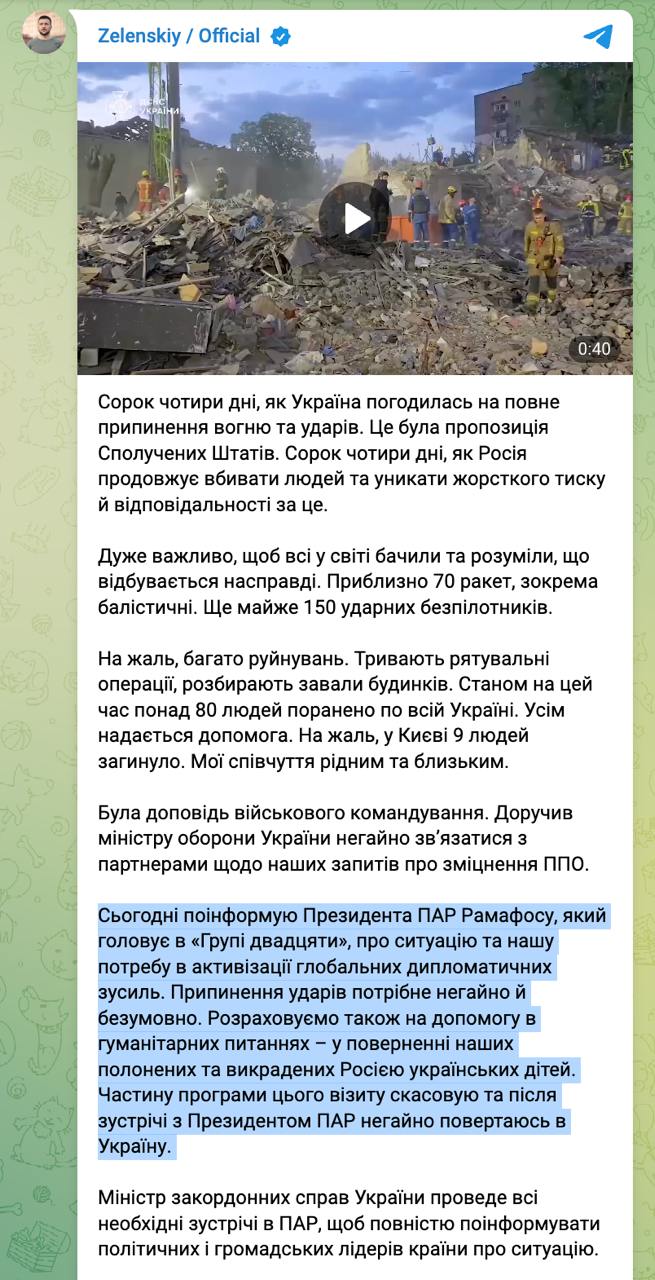 "Сьогодні проінформую Президента ПАР Рамафосу, який головує у "Групі двадцяти", про ситуацію та нашу потребу в активізації глобальних дипломатичних зусиль. Припинення ударів потрібно негайно і безумовно. Частину програми цього візиту скасовую і після зустрічі з Президентом ПАР негайно повертаюся до України", - сказав він.