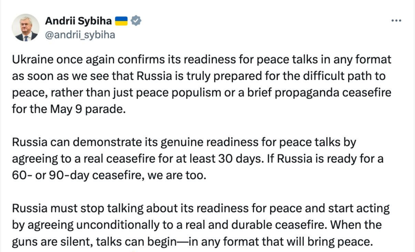"Україна вкотре підтверджує свою готовність до мирних переговорів у будь-якому форматі, як тільки ми побачимо, що Росія справді готова до важкого шляху до миру, а не лише до мирного популізму чи короткочасного пропагандистського перемир'я заради параду 9 травня", - написав він у соцмережі Х.