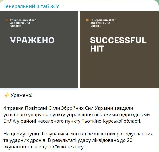 Повітряні сили Збройних сил України завдали удару за пунктом управління російськими підрозділами безпілотників у районі населеного пункту Теткіно Курської області РФ.