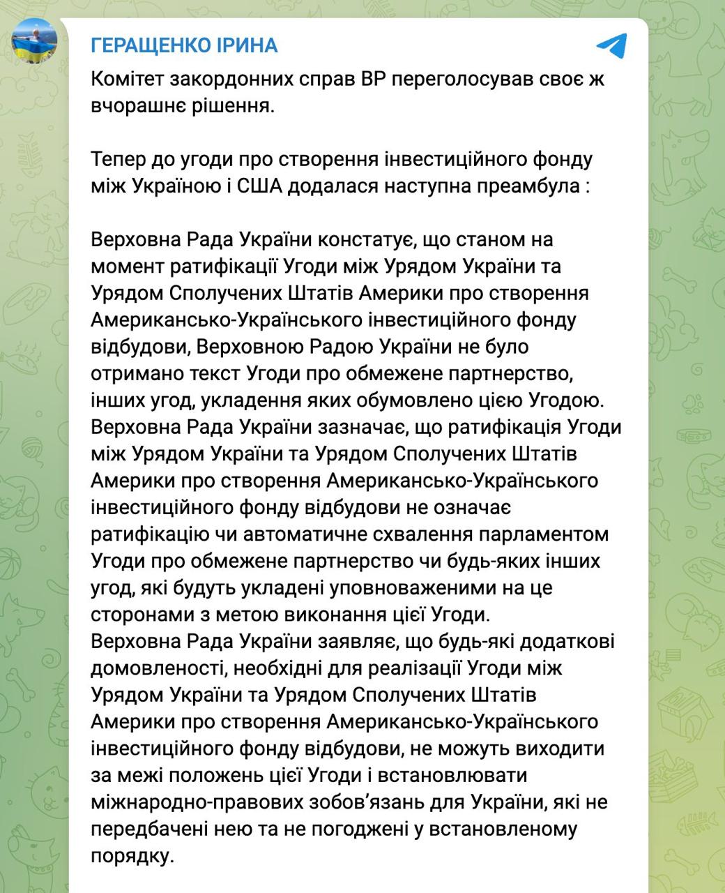 Комітет Верховної Ради із зовнішньої політики та міжпарламентського співробітництва переголосував своє вчорашнє рішення щодо ресурсної угоди зі США, додавши до неї нову преамбулу. У преамбулі сказано, що парламент ратифікує лише один відомий їй документ угоди.