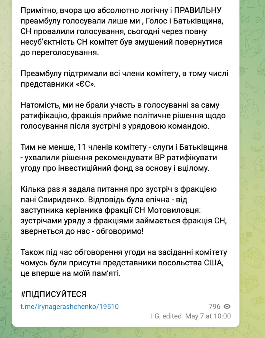 Таким чином, якщо ресурсну угоду ратифікують із зазначеною поправкою, то це означатиме, що або Володимир Зеленський повинен буде вносити договір про обмежене партнерство на ратифікацію до Ради, або потім з'явиться можливість будь-якої миті оскаржити угоду та визнати її нікчемною, оскільки вона не була повністю ратифікована парламентом.