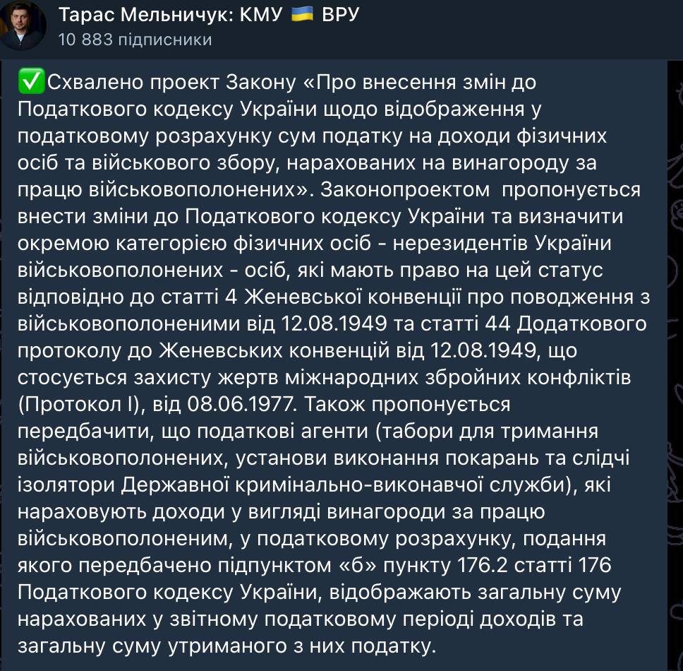 Про це повідомив у своєму телеграм-каналі представник уряду у Верховній Раді Тарас Мельничук.