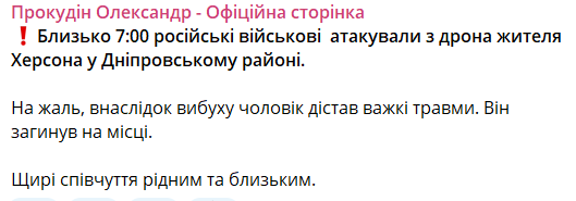 08:10 Близько 7:00 російські військові атакували з дрона жителя Херсона на Дніпровському районі, повідомляє ОВА.