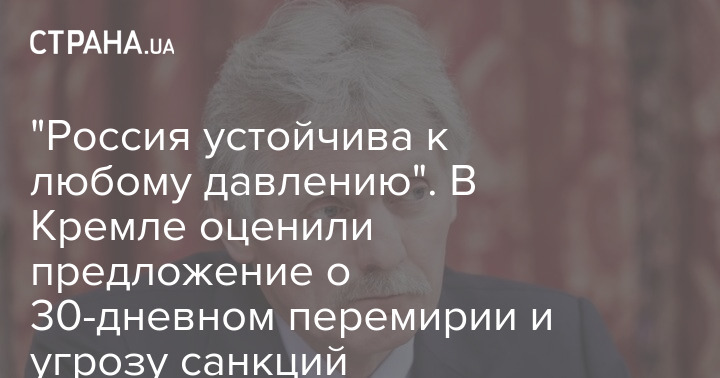 Спікер Кремля також прокоментував пропозицію встановити перемир'я на 30 днів та погрози країн Заходу ввести санкції проти РФ у разі відмови від зупинки бойових дій. Він заявив, що Кремль вивчить цю пропозицію і додав, що "Росія стійка до будь-якого тиску".