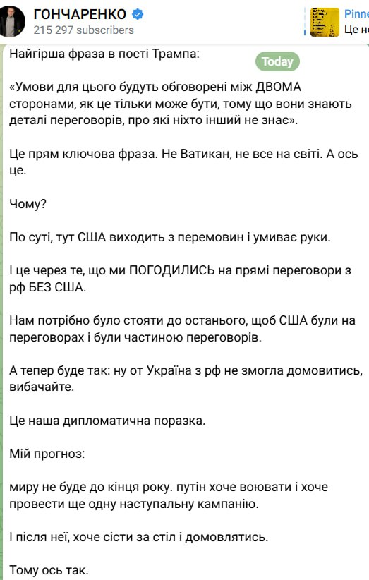 "Гірша фраза в посту Трампа: "Умови для цього будуть обговорені між Двома сторонами, як це тільки можливо, тому що вони знають деталі переговорів, про які ніхто інший не знає". Це пряма ключова фраза. Не Ватикан, не все на світі. А ось це. Чому? По суті, тут США виходять з переговорів."
