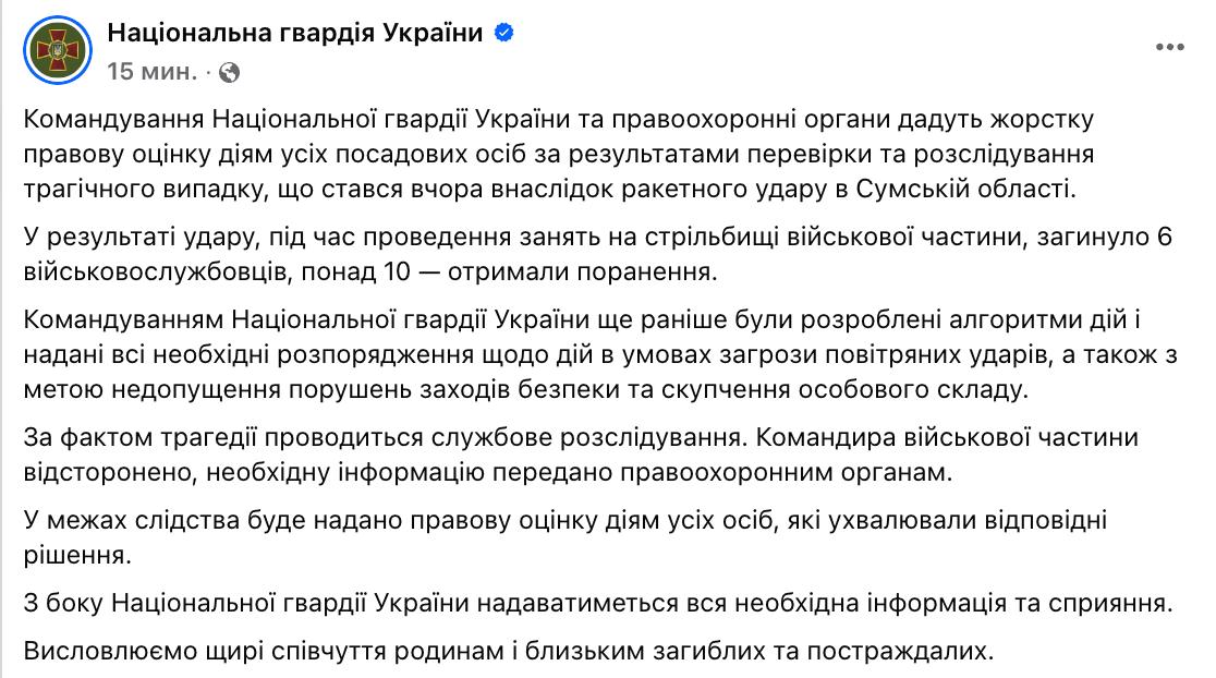 За її даними, загинули шестеро військових, десять поранено. Під час ракетного удару вони проводили навчання на стрільбищі.