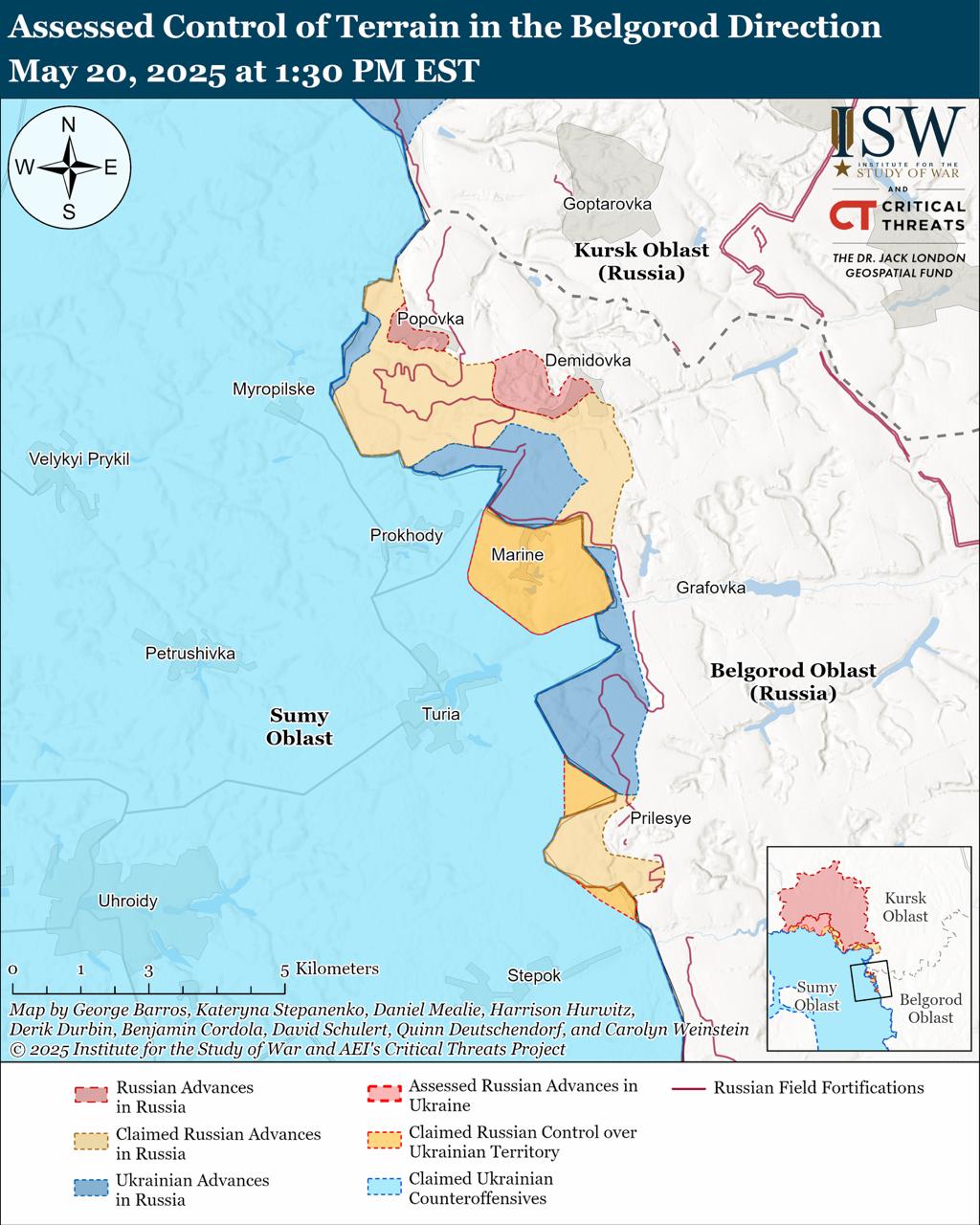 При цьому на території сусідньої Сумщини ще з березня просуваються російські війська. В останньому зведенні американського Інституту вивчення війни йдеться про те, що вони просунулися в південно-західній частині Локні, поряд із трасою Суми - Суджа, і захопили поля на захід від села.