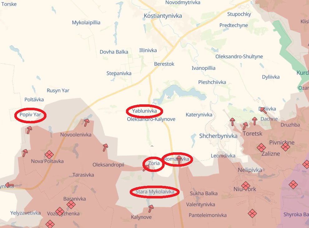 18:33 На Костянтинівському напрямку російська армія зайшла до Попова Яру, взяла під контроль частину Яблонівки та Зорі, а також повністю опанувала Стару Миколаївку та Романівку, повідомляє військовослужбовець ЗСУ з позивним Мучною.