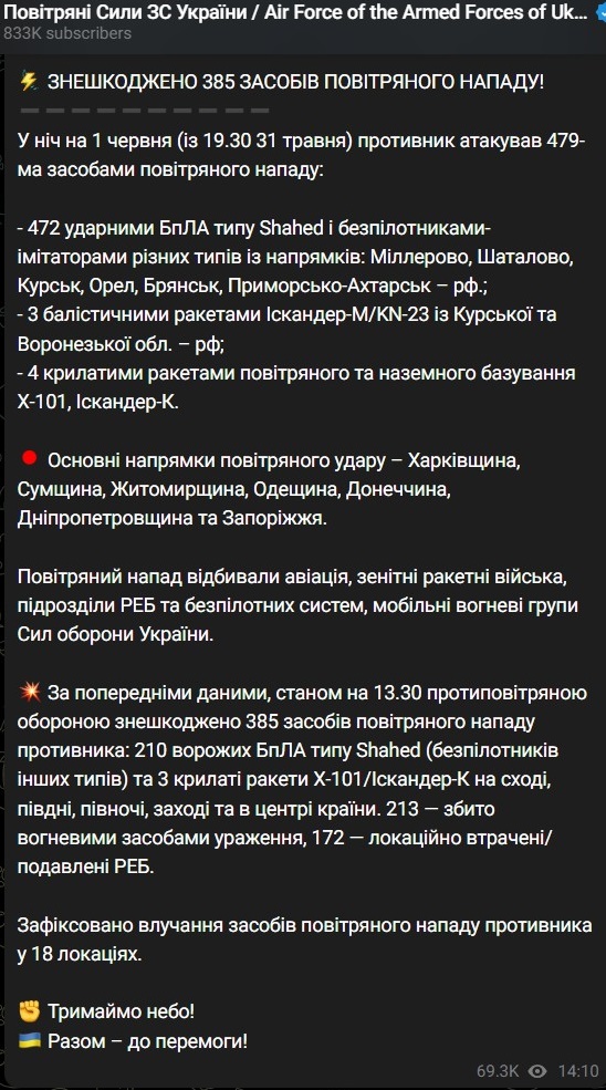 14:59 Повітряні сили ЗСУ заявляють про рекордну за кількістю задіяних засобів поразку російський удар по Україні в ніч на 1 червня - було запущено 472 ударними БпЛА типу Shahed та безпілотники-імітатори (з них збито 210 шахедів і ще 172 локаційно втрачені) Іскандер-М/KN-23, 4 крилаті ракети Х-101, Іскандер-К (збито 3).
