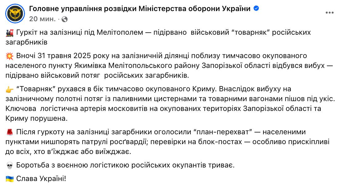 08:56 Українськими силами було підірвано поїзд під Мелітополем – у районі Якимівки, повідомляє ГУР.