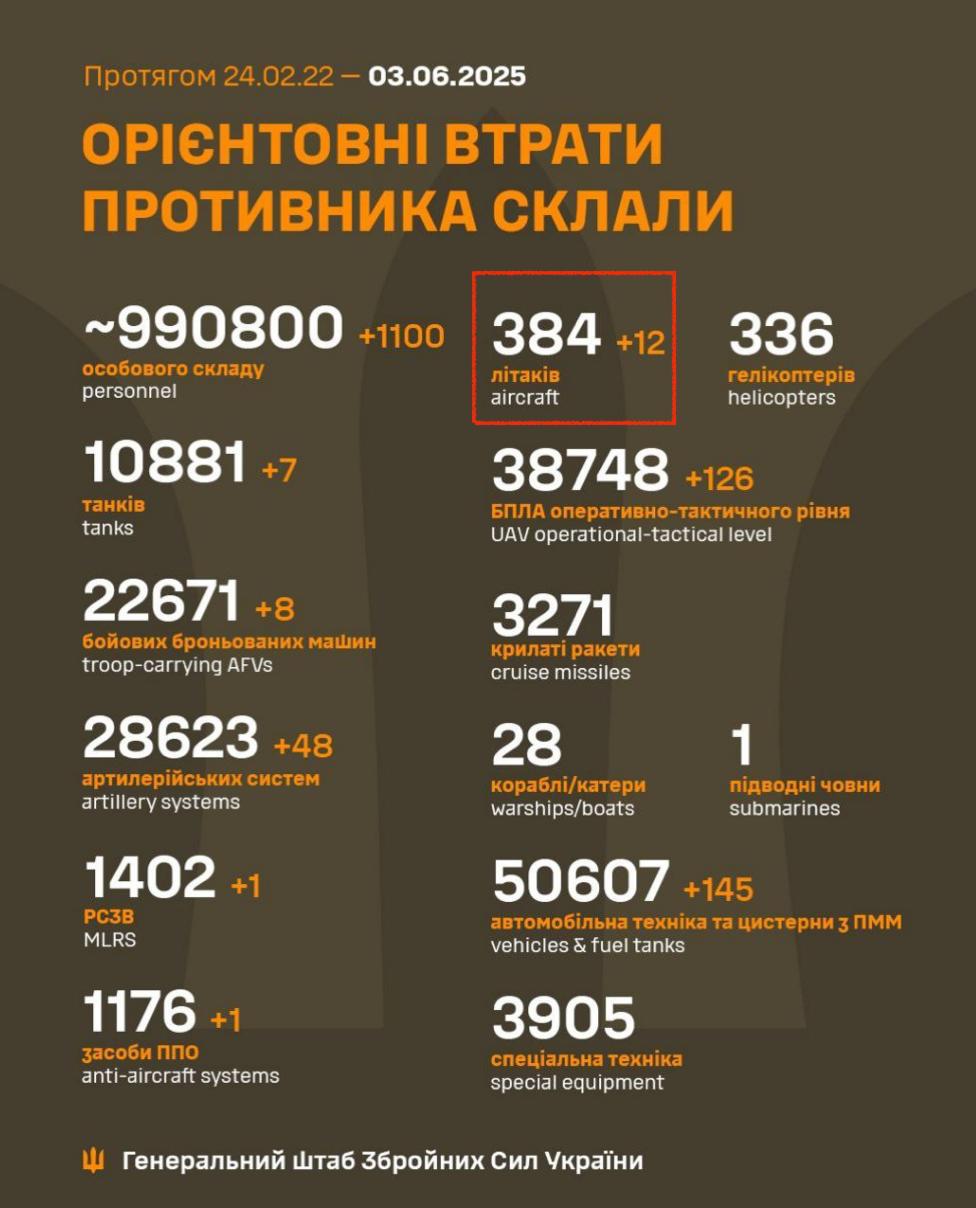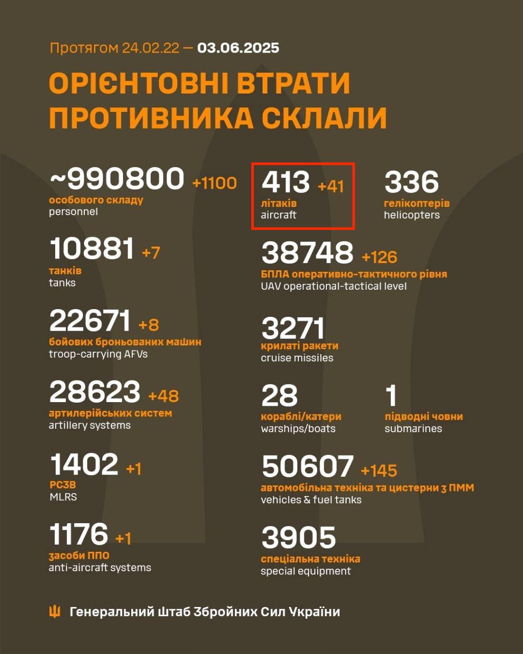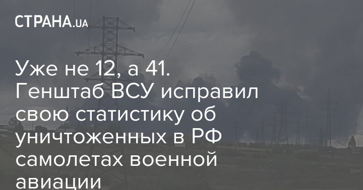 Генеральний штаб ЗСУ відкоригував свою статистику знищених російських військових бортів. Відомство тепер заявляє про поразку під час недільного нальоту 41 російського літака, а не 12, як було ще вранці.