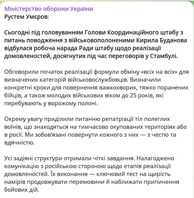 Також Умеров повідомив, що голова ГУР Буданов провів нараду штабу щодо реалізації домовленостей, досягнутих під час переговорів у Стамбулі.