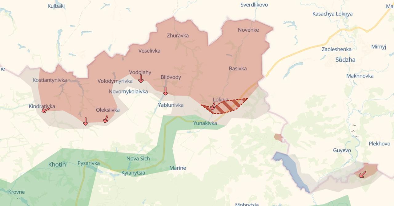 Складна ситуація складається і на ділянці Новомиколаївка-Варачино-Яблонівка-Юнаківка, де російські військові намагаються зайняти населені пункти та закріпитися, незважаючи на значні руйнування в Юнаківці. У районі Локні ЗС РФ намагається просуватися на схід від села до лісів у напрямку Садків, що створює серйозні складнощі для його витіснення.