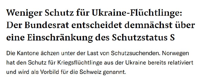 Швейцарська народна партія (ШНП) внесла до Національної ради пропозицію посилити надання статусу захисту S для українських біженців, аргументуючи це тим, що ситуація на значній частині території України стабілізувалася і там немає бойових дій.